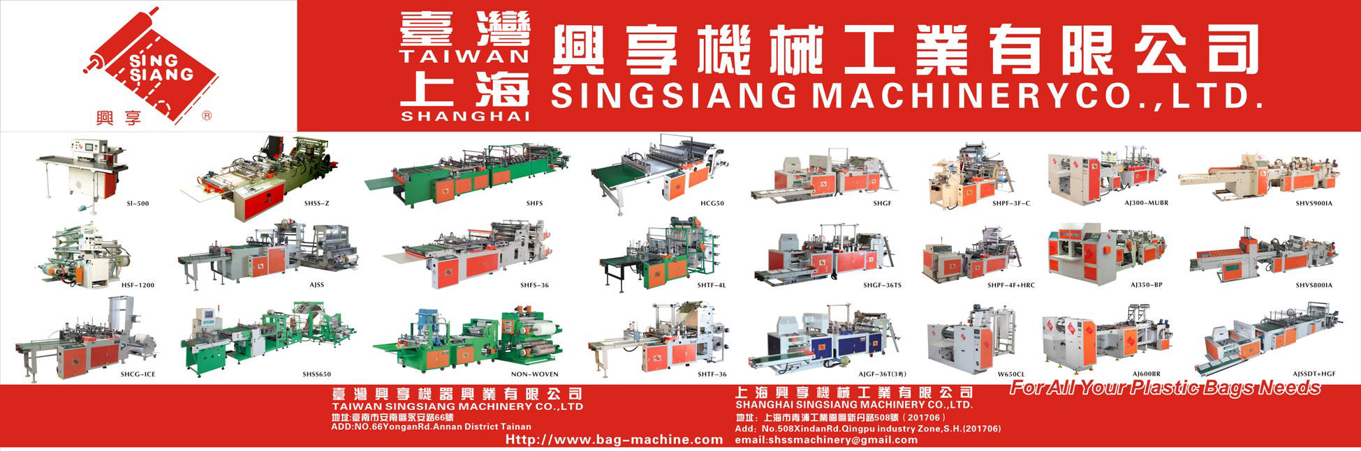 Taiwan Sing Siang Machinery, specialized in manufacturing of all kind plastic bag making machinery.